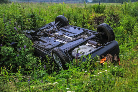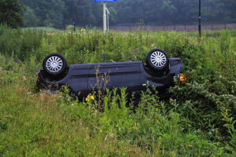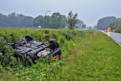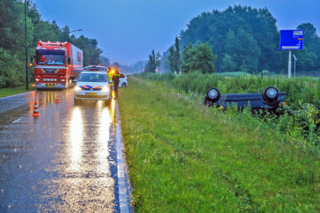 Een personenauto met 2 inzittenden belandde vanochtend vroeg op de kop in een greppel van de Europaweg. De auto kwam uit de richting Eindhoven en raakte door onbekende oorzaak van de weg.