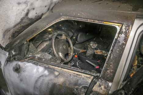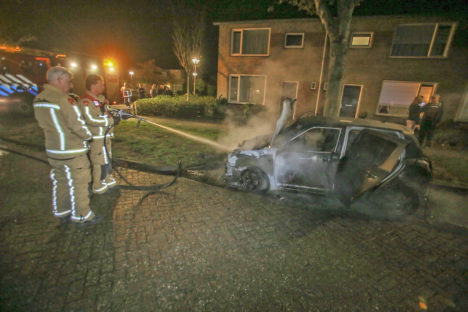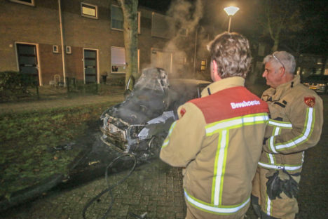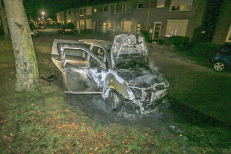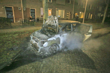 De auto is volledig uitgebrand en zal worden opgehaald door een takelbedrijf. De politie doet een buurtonderzoek en is op zoek naar camerabeelden.
