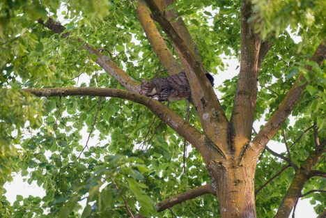 De om 19.43 uur gealarmeerde brandweer snoeide enkele takken van de boom om zodoende bij het diertje te kunnen komen. Nadat de kat met enige moeite was gevangen, ging het er (bij het betreden van Moeder Aarde) als een haas vandoor.
