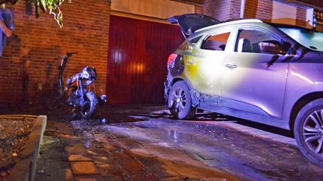 Vannacht kort voor half 2 werden bewoners aan de Glanzerhof in de Rijpelberg wakker van een knal. Zij zien dat een brommer op de oprit in brand staat. De politie komt ter plaatse en blust het vuur, maar kon niet voorkomen dat ook de ernaast geparkeerde auto flink wat brandschade opliep. De brommer werd waarschijnlijk bewust aangestoken.
