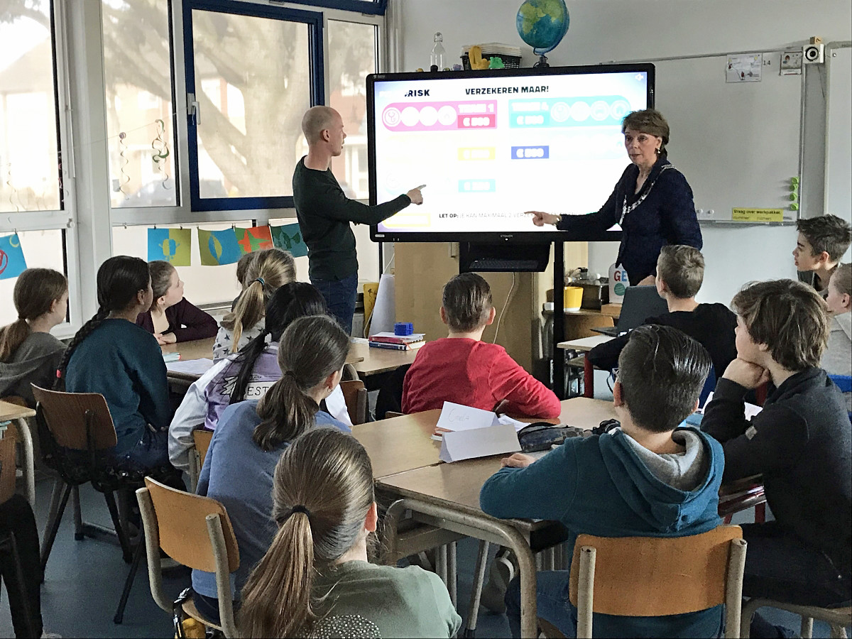 Met behulp van het lesprogramma van ‘Fix je Risk’ gaf Blanksma (tevens voorzitter Raad van Toezicht bij het Nibud) samen met Geert-Jan van der Veen (adviseur Nibud) vanochtend die gastles. De les gaf een toelichting op het onderwerp verzekeringen. Daarin leerden de kinderen in die context wat de term ‘risico’ betekent en hoe je weet of een verzekering nodig is. Tevens werd er een spel gespeeld waarin de kinderen spelenderwijs de geleerde theorie konden toepassen.