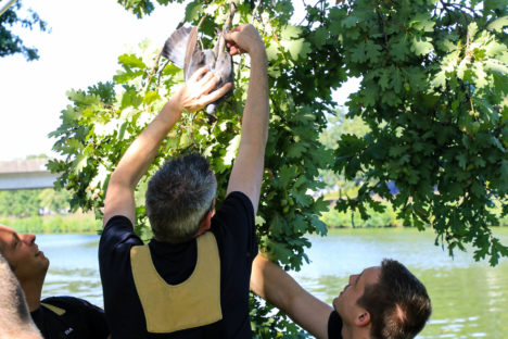 Voorbijgangers op het fietspad Piet van Bokhovenpad zagen vanmiddag een duif op een vreemde manier in een boom bewegen. Het bleek dat het beestje met zijn pootje in een stuk visdraad in een boom vast was komen te zitten.