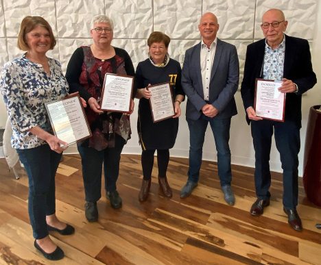 Vanmiddag reikte wethouder Harrie van Dijk 4 vrijwilligerspenningen van de gemeente uit aan 4 vrijwilligers van de afdeling Vrijwillig Patiëntenvervoer van het Elkerliek ziekenhuis. De 4 die in de bloemen werden gezet zijn mevrouw M.C.W. van Deursen-van Veijfeijken (was op 15 mei 2020 25 jaar werkzaam op de afdeling), mevrouw A.M. Claassen-van Deursen (was er op 11 september 2020 25 jaar werkzaam), mevrouw A.M. Klerkx-Klerkx (was er op 15 december 2020 25 jaar werkzaam) en de heer G.P.C. Boogaarts (was er op 1 december 2021 25 jaar werkzaam).