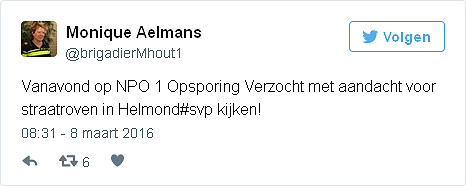 Wijkagent Johan Meeuwsen was vanochtend betrokken bij de filmopname voor de uitzending. Bureau Brabant op Omroep Brabant begint maandag om 18.15 uur en wordt ieder uur herhaald tot dinsdag 17.15 uur.