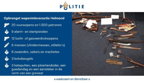 In totaal werden in die periode 70 wapens ingeleverd. Daar zaten 20 vuurwapens bij en nog 27 andere schietwapens of wapens die daarop lijken, zie de afbeelding onderaan.