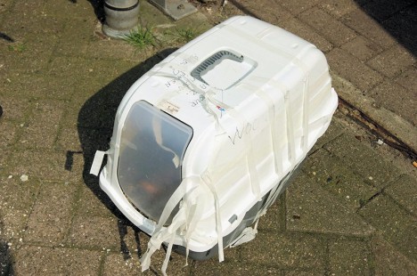 “Hij was heel merkwaardig verpakt: hij zat in een dichtgetapete kattenbak. Na opening kwam niet alleen de kater maar ook een berg oude droge drollen tevoorschijn, plus een leeg bierblikje en een batterij. Vreemde collectie!” zo laat de Stichting Dierenambulance Helmond weten.