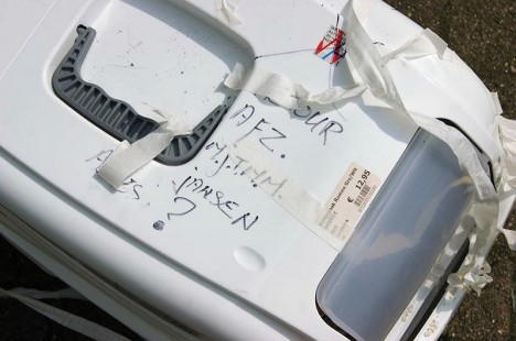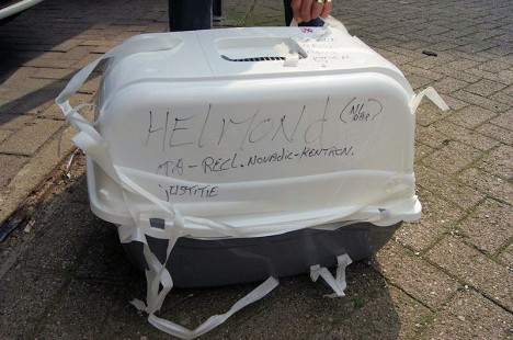 De politie kon niet vertellen wie de kattenbak bij hen was komen afgeven. Op het deksel van de kattenbak was een postzegel geplakt waarover met viltstift een kruis was gezet. Er was van alles op de deksel geschreven. Retour afzender, 5 voorletters en dan Jansen, adres vraagteken, p.a. recl./Novadic Kentron, justitie, SMO, Woonpartners.