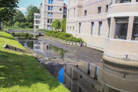 Door een lek in de riolering van de gracht van Kasteel-Noord dreigt massale vissterfte. Op meerdere plekken staat die gracht bij het appartementencomplex nagenoeg droog met een klein poeltje water.
