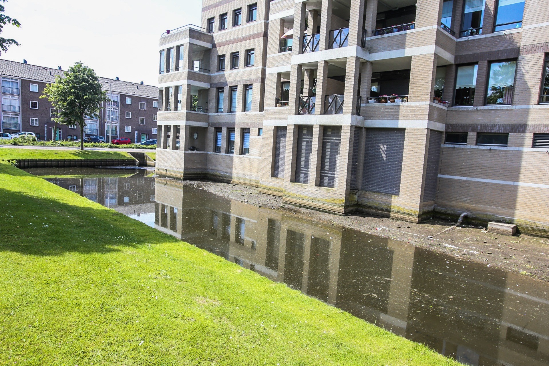 Door een lek in de riolering van de gracht van Kasteel-Noord dreigt massale vissterfte. Op meerdere plekken staat die gracht bij het appartementencomplex nagenoeg droog met een klein poeltje water.
