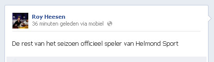 Roy Heesen zal de rest van het seizoen gehuurd worden door Helmond Sport. Dat blijkt althans uit zijn Facebook-bericht dat zojuist verscheen en dat Helmond Sport bevestigde: