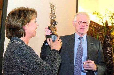 De voorzitter van de winnende Stichting het Kasteel van Sinterklaas Meint Veninga, ontving de sculptuur van de Helmondse kunstenaar Willem van der Velden. Wim van den Broek maakte de foto.