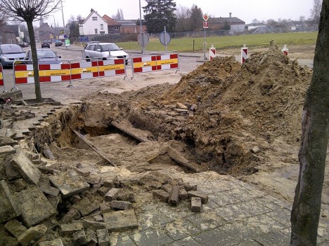 Het gat van 1 bij 1 meter in het trottoir is inmiddels een stuk groter geworden door de werkzaamheden vannacht. Zie onderstaande foto van Henri van Vonderen, de wijkagent in Mierlo-Hout.