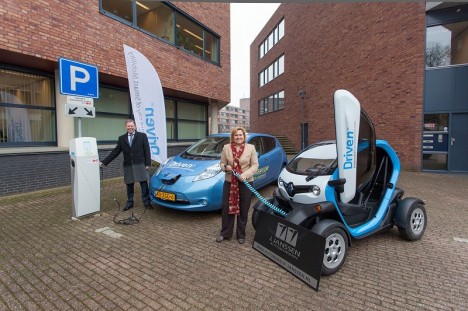 PressVisuals maakte onderstaande foto waarop wethouder Yvonne van Mierlo de Renault Twizy en wethouder Peter Tielemans de Nissan Leaf in gebruik nemen.