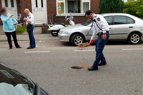 Toen hem gevraagd werd om zijn rijbewijs vertelde hij dat deze in zijn auto ligt, geparkeerd bij zijn bedrijf gelegen aan de Roggedijk. Zekerheidshalve werd besloten met hem mee te rijden naar zijn bedrijf. De chauffeur haalde uit zijn personenauto het rijbewijs. De politie rook een sterke diesellucht uit zijn wagen komen en vond dat verdacht. De agenten besloten daarop terug te rijden naar de plek waar de vrachtwagenchauffeur aanvankelijk achteruit wilde rijden. Ter hoogte van de kruising Gerstdijk-Kadeweg werden langs de weg in bobosschages twee jerrycans aangetroffen. De jerrycans waren gevuld met diesel. Even verderop lag een slang, die vermoedelijk wordt gebruikt voor het overhevelen van brandstof. Daarop werd besloten de chauffeur alsnog aan te houden. Hij werd overgebracht naar het politiebureau en is hier ingesloten voor verder onderzoek. De jerrycans en andere spullen zijn in beslag genomen.