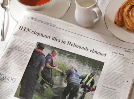 De olifant is zwaar beschadigd en waarschijnlijk niet meer te repareren. Hij is nu op weg naar de eigenaar.