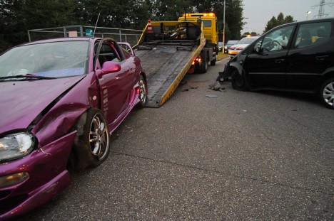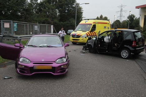 Bestuurder van de paarse auto is naar het ziekenhuis gebracht.