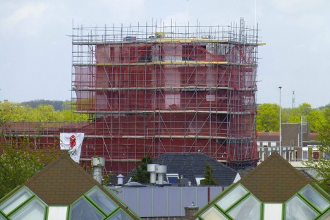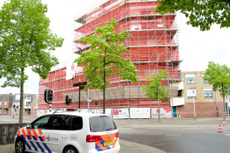 Rond 4 uur vanmiddag zette de politie Binderseind in het centrum af. Daar vielen op de rijbaan steigerplanken van een gebouw in aanbouw. Bij die nieuwbouw (die bijna het hoogste punt heeft bereikt) hangen nu nog meerdere steigerplanken los.