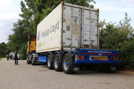 Politieagenten doen onderzoek bij een vermoedelijk gestolen vrachtauto op Varenschut op het industrieterrein. Op dit moment kan de politie nog niets zeggen over de eventuele lading.