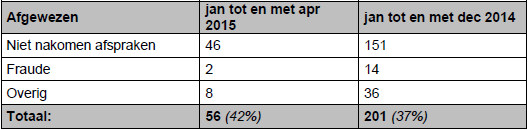 Antwoord: In 2014 zijn 537 dossiers afgesloten. Hiervan zijn er 201 afgewezen. In 2015 (jan. t/m april) zijn 138 dossiers afgesloten. Hiervan zijn er 56 afgewezen.