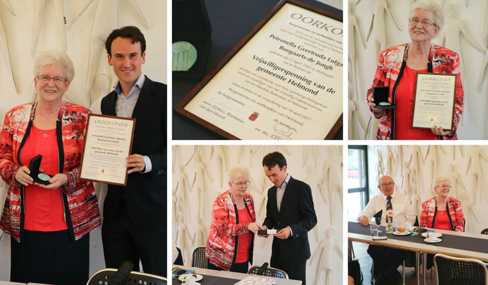 Deze onvermoeibare vrijwillige inzet gedurende vele jaren is voor burgemeester en wethouders aanleiding geweest haar de vrijwilligerspenning van de gemeente Helmond toe te kennen.