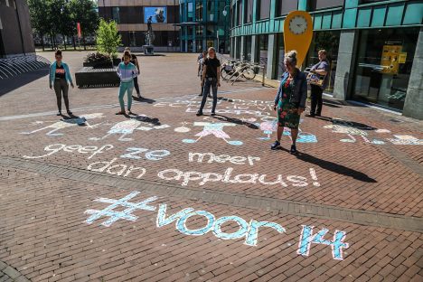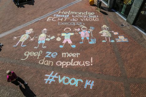 Vanmiddag hielden we met de FNV een stoepkrijtactie op het Boscotondoplein (bij Pathé). Tijdens de gemeenteraadsvergadering vanavond dient mijn partij namelijk deze motie in met als slogan; ‘Niet klappen maar lappen!’ We roepen de andere raadsleden op om ook ‘voor 14’ te stemmen. Ik hoop van harte dat we vanavond allemaal trots kunnen zijn op Helmond omdat we als eerste op de bres gingen om deze kloof tussen rijk en arm te dichten.