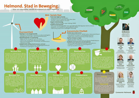 Dit akkoord, met de titel ‘Helmond. Stad in Beweging.’ (pdf), biedt voor deze vijf partijen richting voor een duurzame, sociale en economisch vitale toekomst voor Helmond. Dankzij de gunstige economische vooruitzichten en vanuit een solide financieel kader doet de nieuwe coalitie extra investeringen in de stad. De coalitie kiest koers en wil deze de komende jaren samen met de raad en stad vormgeven. Met ambities en middelen in balans, maatwerk als uitgangspunt en de mens centraal.