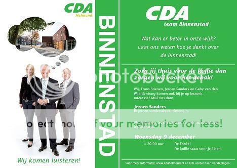 Onder het motto ‘Zorg jij thuis voor de koffie dan zorgen wij voor het gebak!’ werft het team Binnenstad via strooibiljetten (zie onder) en hun website mensen die de partijleden thuis bij willen praten. Deze persoonlijke aanpak is nieuw in de regio. Het CDA voert, net als veel andere partijen, ook campagne met bijeenkomsten in de wijken en -kijk- en luisteravonden-, zoals in Helmond-Noord en met jongeren die op stap zijn op de Steenweg. "Het valt niet altijd mee om zaaltjes vol te krijgen. Daarom hebben we gekozen voor deze meer persoonlijke benadering,’ vertelt Sanders. Hij denkt ook aan 'keukentafelgesprekken' en andere mogelijkheden om rechtstreeks te horen wat leeft in de stad. ‘Wij politici hebben wel ideeën maar willen nu eens heel uitdrukkelijk van de mensen horen wat zij belangrijk vinden voor Helmond.” Volgens Sanders zijn intussen de eerste 7 afspraken gemaakt. Een eerste resultaat van de gesprekken met jongeren: in de zomer heeft Helmond volop activiteiten, in de winter is het maar een dooie boel.