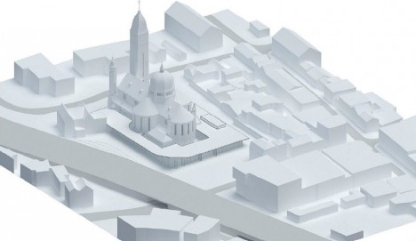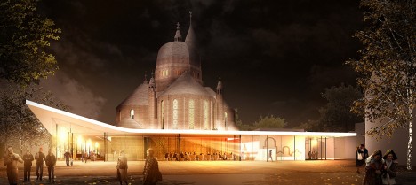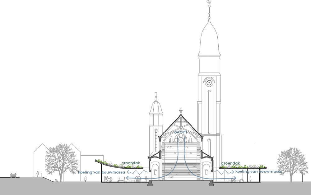 Daaronder een impressie hoe het ook had kúnnen worden als de gemeente dat ontwerp van LX ARCHITECTEN had gekozen. En tenslotte zie je een foto van de OLV-kerk vanuit de lucht voordat ’t Speelhuis daar haar intrek nam.
