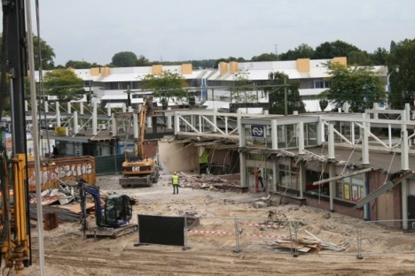 Sinds vandaag wordt het huidige NS-stationsgebouw officieel gesloopt. Maar de enthousiaste aannemer kon blijkbaar niet wachten: gistermiddag werd aan de voorzijde de overkapping met de karakteristieke rode balken al neergehaald. Zie de onderstaande foto’s die Henry en Huub gisteren maakten.