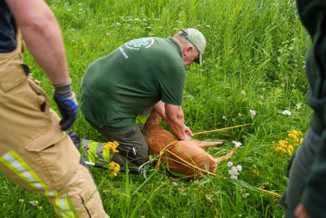 Na enige tijd heeft de brandweer de drenkeling kunnen vangen en aan wal gezet. Daar werd de ree door een Dierenambulance-medewerker weer vrijgelaten.