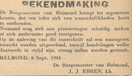 Bekendmaking in de plaatselijke krant De ZuidWillemsvaart 7 september 1944, twee dagen na Dolle Dinsdag